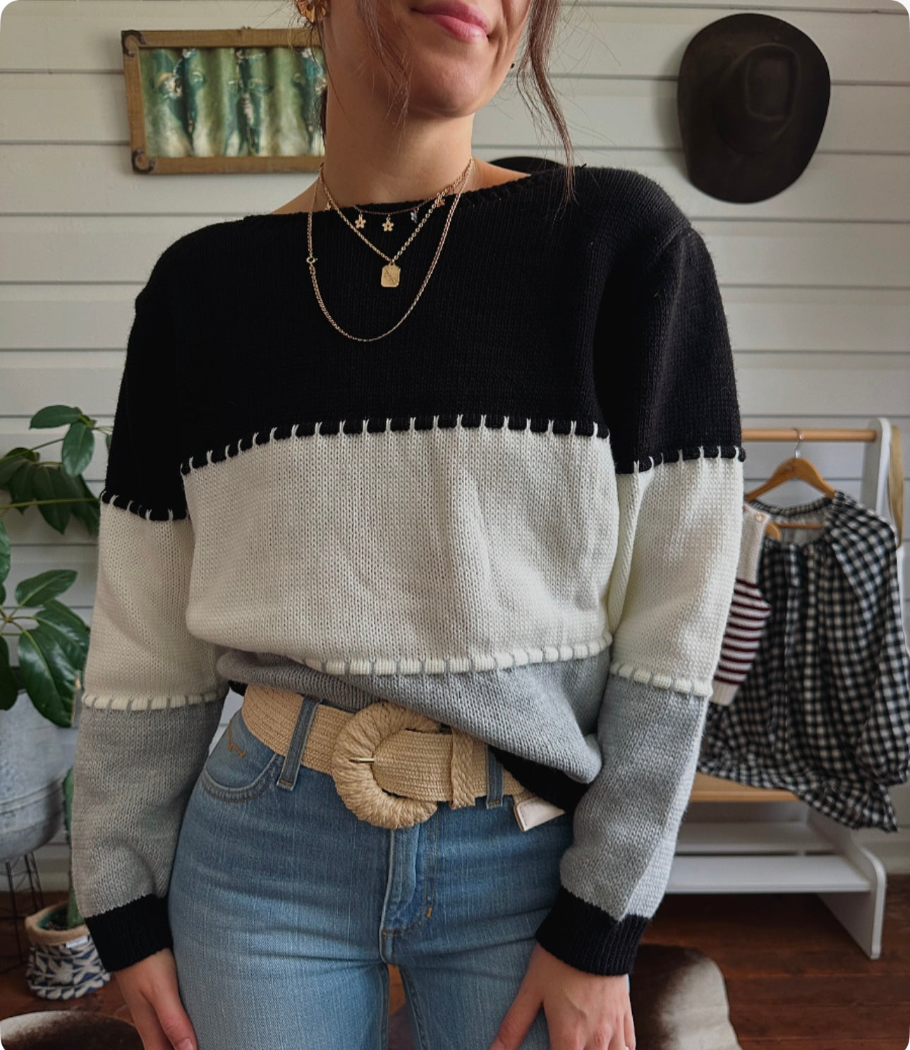 The Harper Colourblock Knit is your new go-to for easy, everyday style. Designed with bold, modern colour blocking in black, cream, and grey, it’s finished with contrast whipstitch detailing for a unique touch. Crafted in a beautifully soft midweight knit, it’s perfect for layering through changing seasons — not too light, not too heavy. Effortless to style with denim, boots, or sneakers for a relaxed yet polished look.