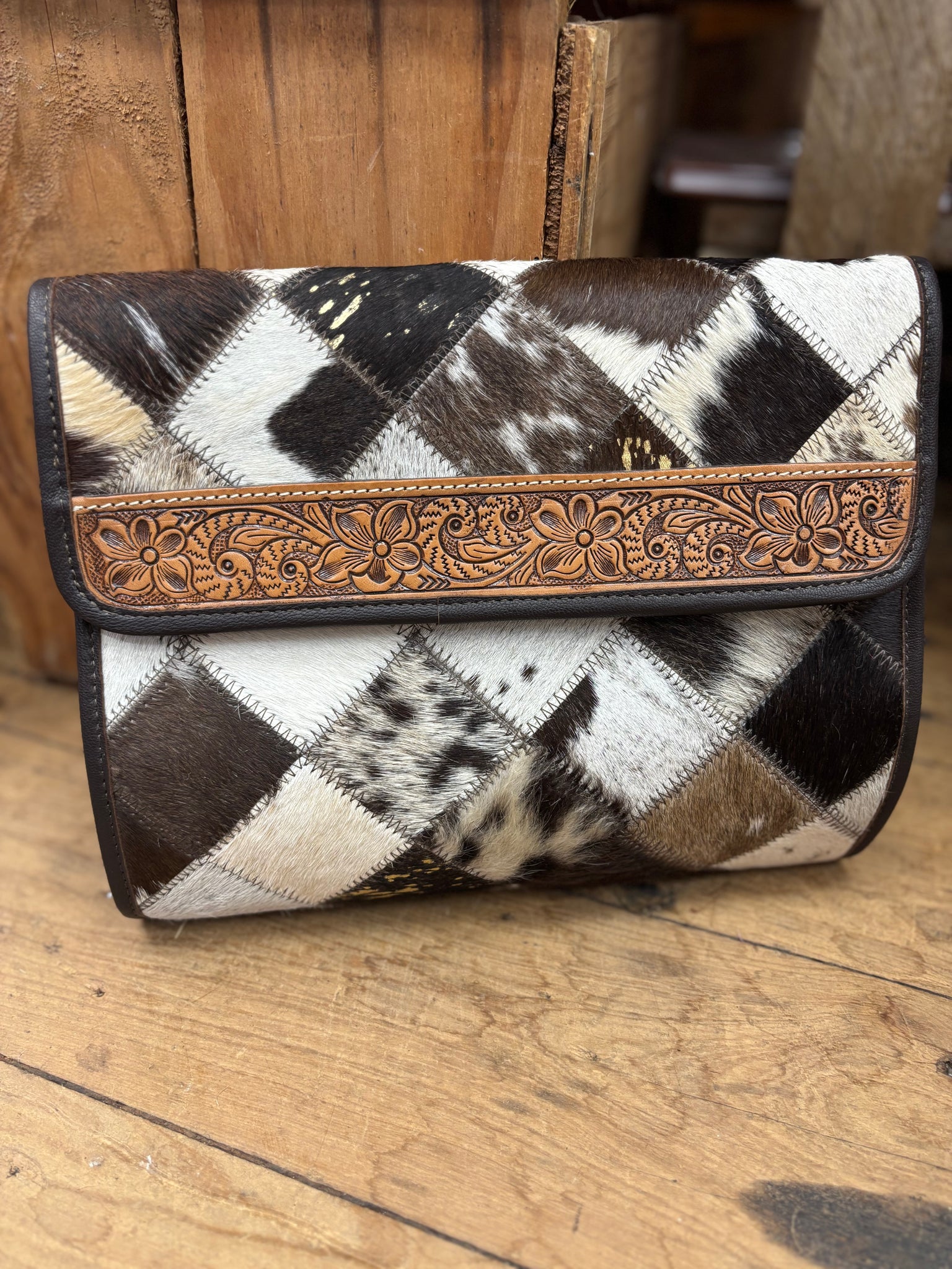 This trendsetting and serviceable Cowhide Makeup Bag with hand carving details is what every women needs. This graceful patchwork cowhide makeup bag is functional and adorable at the same time. It open up to ample storage in plastic zippers for all your makeup needs along with hand tooled details on the flap, to add just a more to it “WOW” factor..