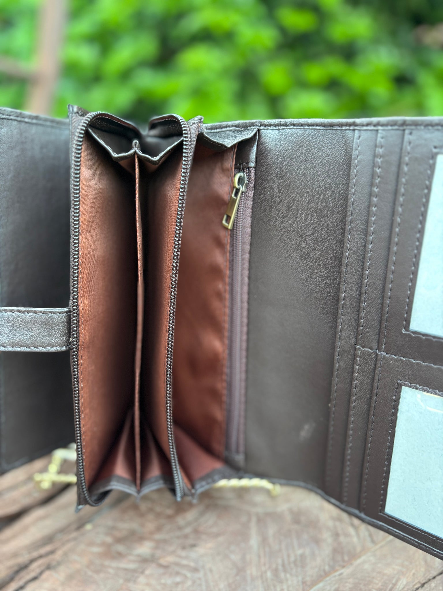 A classic and functional design for women who carry the world in their wallets. This ladies wallet features snap button closures, one zipper on the back, two internal zips, pen loop, credit card slots and two window card slots for your driver’s license or photos, making it the perfect wallet for everyday life as it carries all without the bulk.