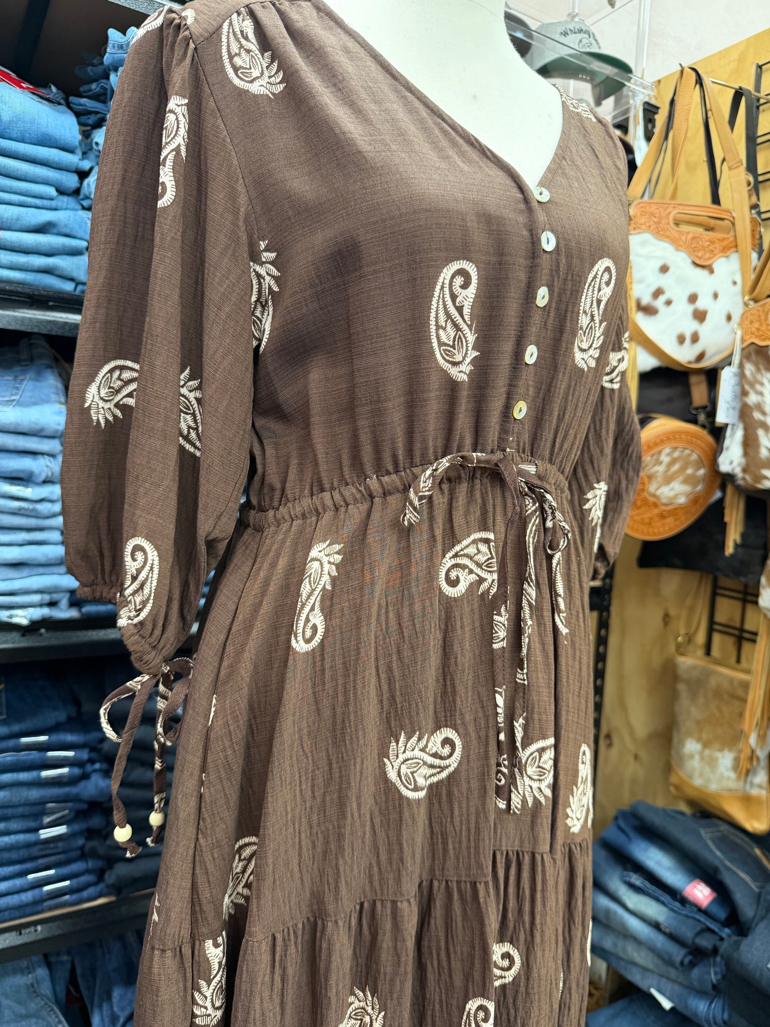 Float through your day in this beautifully crafted brown dress, featuring delicate paisley prints and soft tiered detailing. Designed with a flattering relaxed silhouette, button-front accents, and charming tassel ties, this piece blends comfort with timeless boho sophistication. Perfect for brunch dates, weekend strolls, or elevated everyday wear.