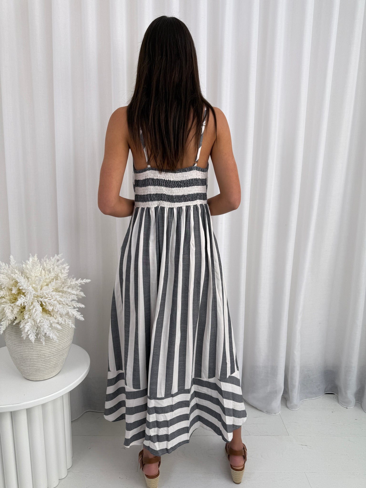 Stay effortlessly stylish in our Harbour Stripe Maxi Dress, featuring bold charcoal and white vertical stripes with a contrasting horizontal stripe hem. Designed with thin adjustable straps, a relaxed flowy fit, and side pockets, this maxi dress is perfect for beach days, casual outings, or layering with a jacket on cooler evenings. Made from a breathable fabric, it’s the ultimate summer wardrobe staple