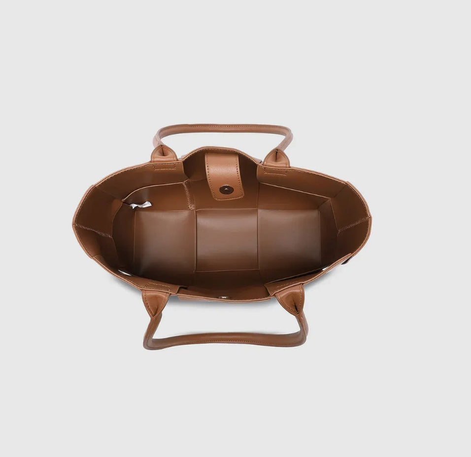The Gwen Chocolate Handbag brings quiet confidence to your everyday style — structured, textural, and effortlessly composed. Designed in a clean, tailored silhouette, this woven shoulder bag showcases smooth vegan leather and is finished with dual top handles for a refined touch. Compact yet considered, Gwen Chocolate offers just the right amount of space for your daily essentials, secured with a discreet magnetic closure for ease and peace of mind. Her woven detailing softens the structure, creating a thoughtful balance between grounded texture and elevated design. Equally suited to weekday plans and weekend errands, Gwen Chocolate’s timeless silhouette works hard in any wardrobe.