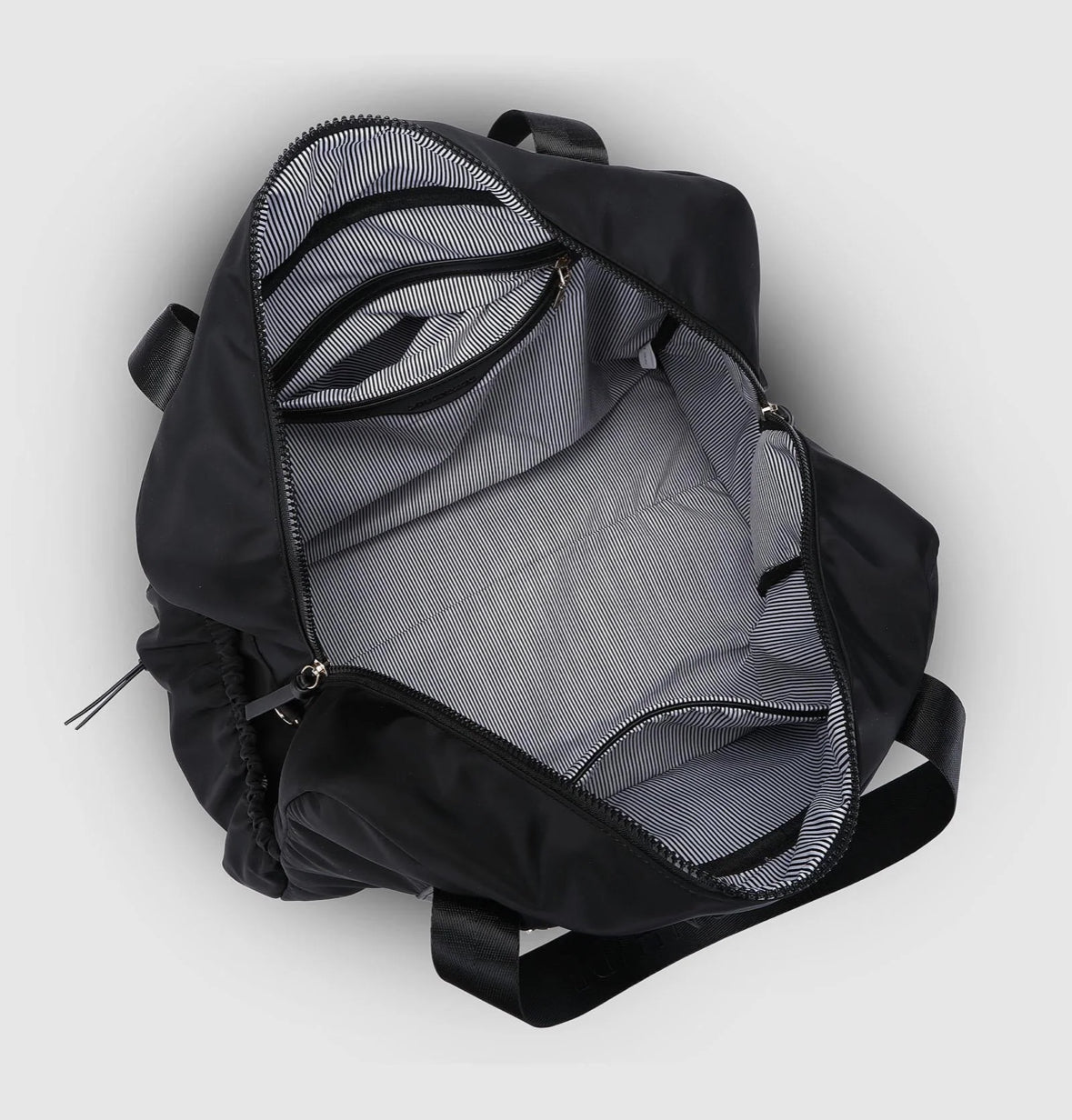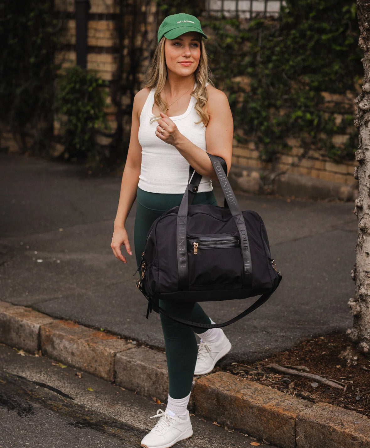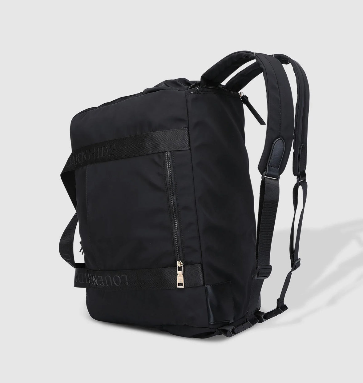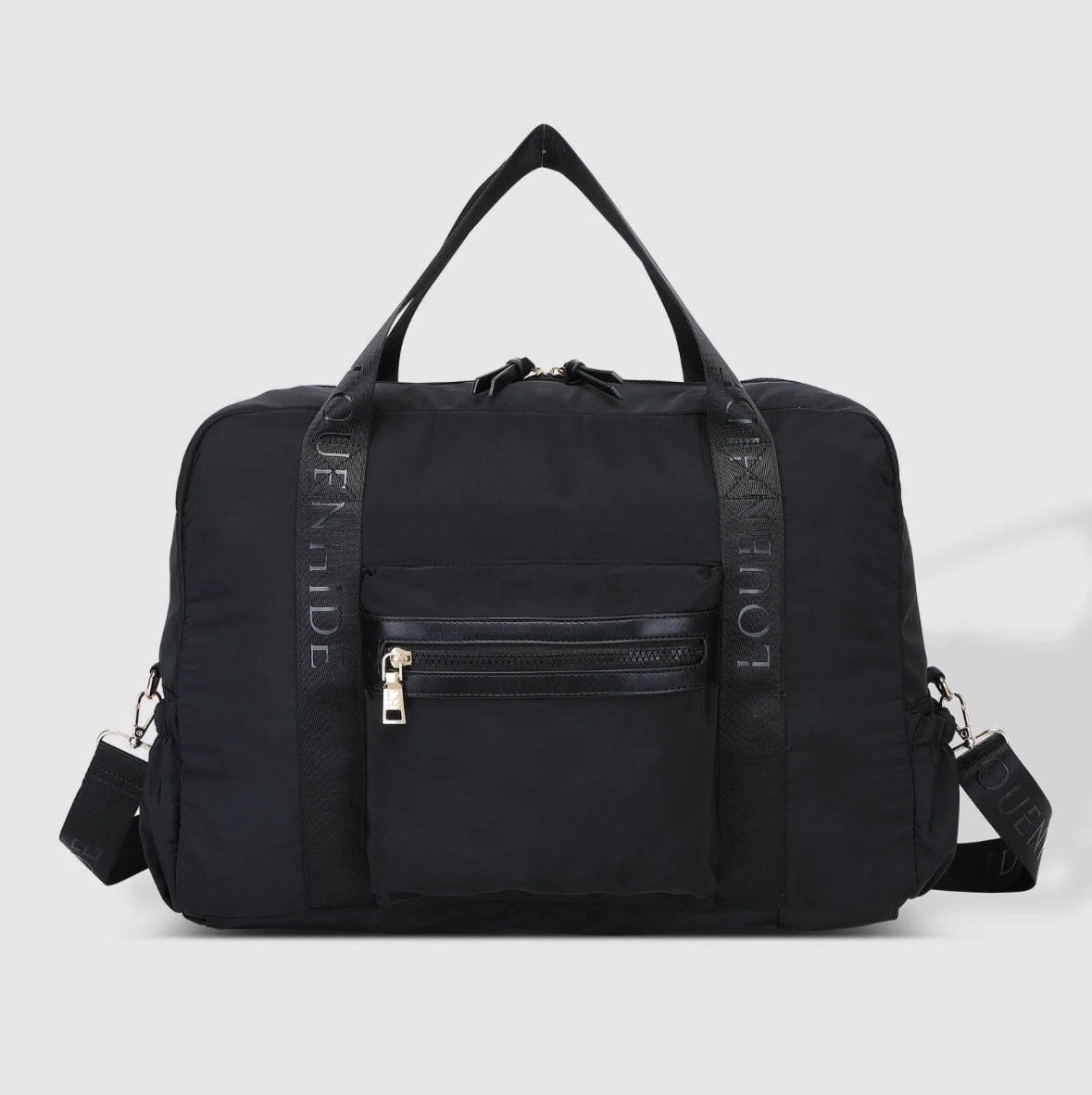 The Jenn Black Nylon Travel Bag is built for life in motion, offering style, space, and smart versatility in one streamlined design. Crafted from lightweight, durable nylon, she’s ready to take you from airport gates to gym floors with ease. Her adaptable design offers four carry options - hold her by the top handles, clip on the adjustable webbing guitar strap for a crossbody look, convert her into a backpack for hands-free adventures, or slip her over your suitcase handle for smooth transit. Two side pockets keep water bottles or umbrellas within easy reach, while a front zip pocket offers quick access to travel documents or on-the-go essentials. Spacious enough for an overnight stay yet refined enough for everyday use, Jenn is the travel bag that keeps pace with wherever the day or weekend takes you. For best results, please use a water-proofer to prevent stains or watermarks. If watermarked, please use a damp cloth and wipe over enter body fabric to remove.