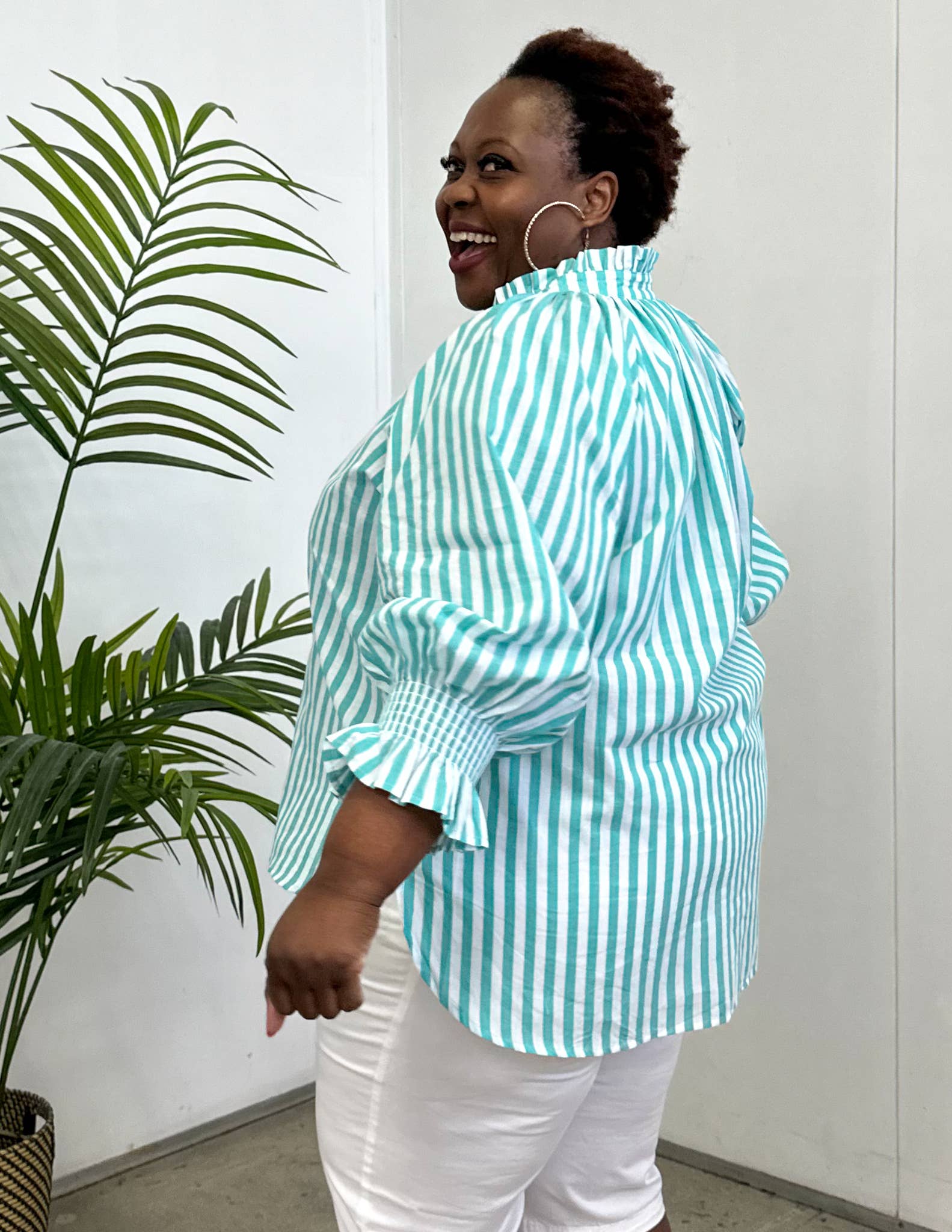 100% Cotton fabric Mandarin neckline front button fastening 3/4 length sleeves with elasticated cuffs High low hems This One Size fits most is designed to fit a size AUS 8 to 20 comfortably. Zibi is 5’2, size AUS 18, wears our one size