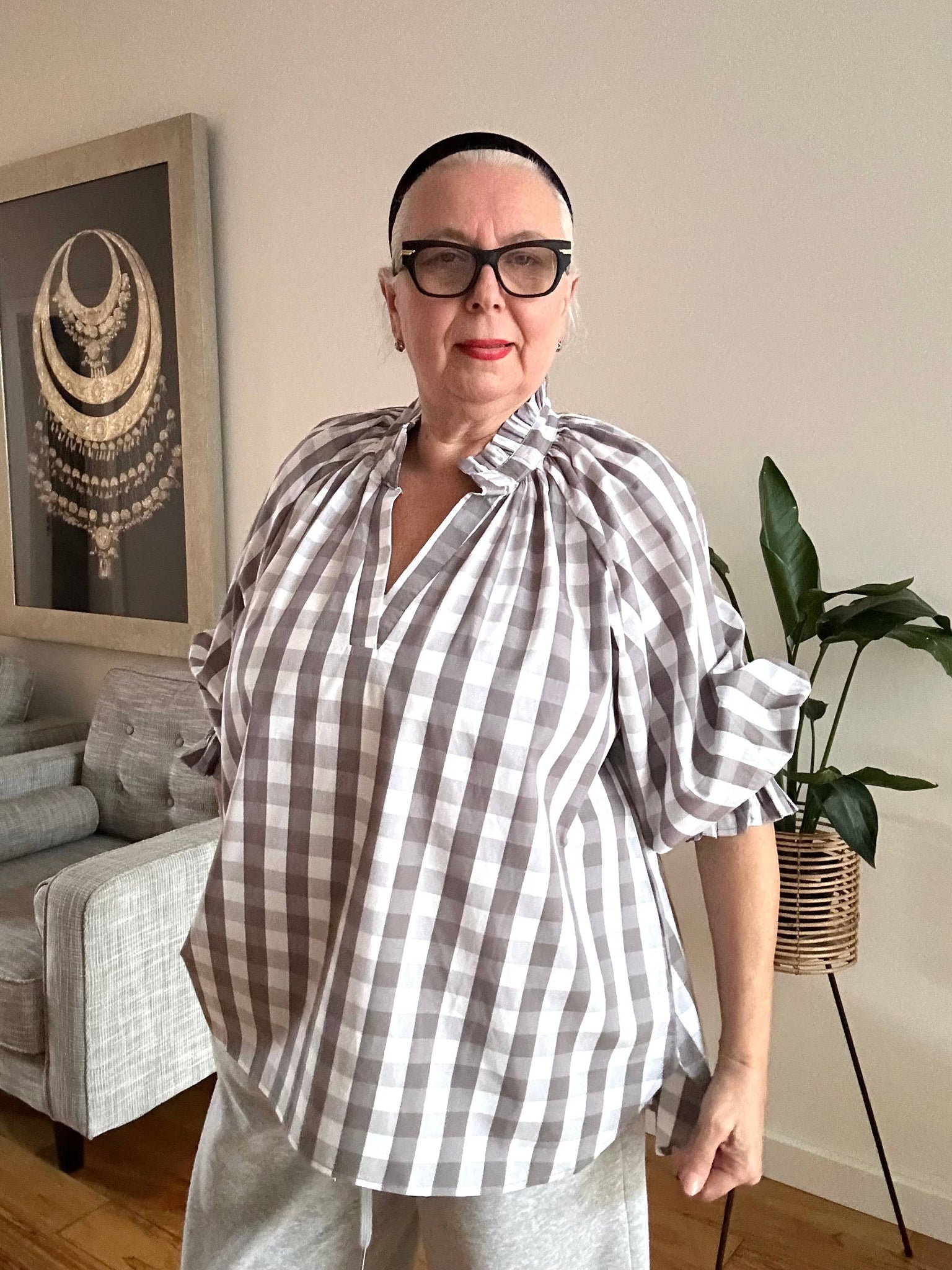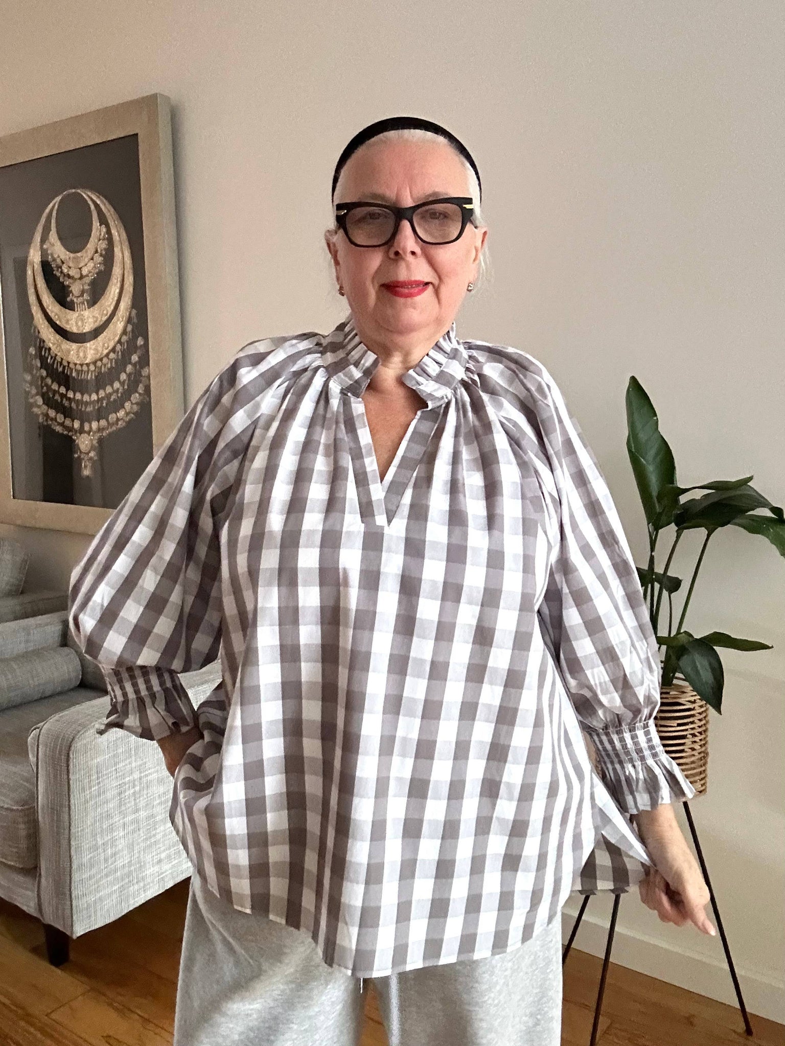 100% Cotton fabric Mandarin neckline 3/4 sleeves with elasticated cuffs High low hems This One Size fits most is designed to fit a size AUS 10 to 20 comfortably Tatiana is 5’7, size AUS 16, wears our one size