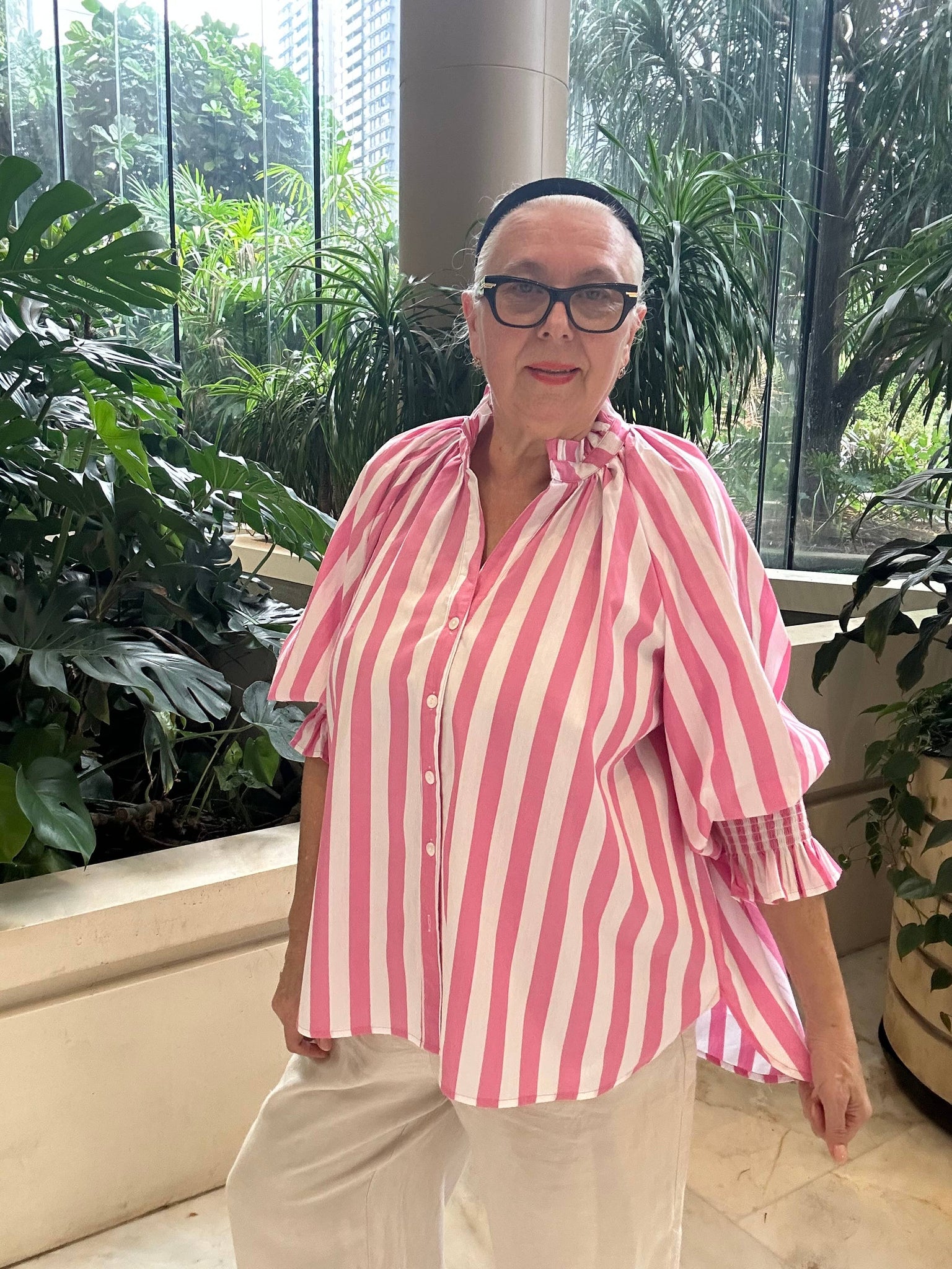 100% Cotton fabric Mandarin neckline with front button fastening 3/4 sleeves with elasticated cuffs High low hems This One Size fits most is designed to fit a size AUS 10 to 20 comfortably Tatiana is 5’7, size AUS 16, wears our one size